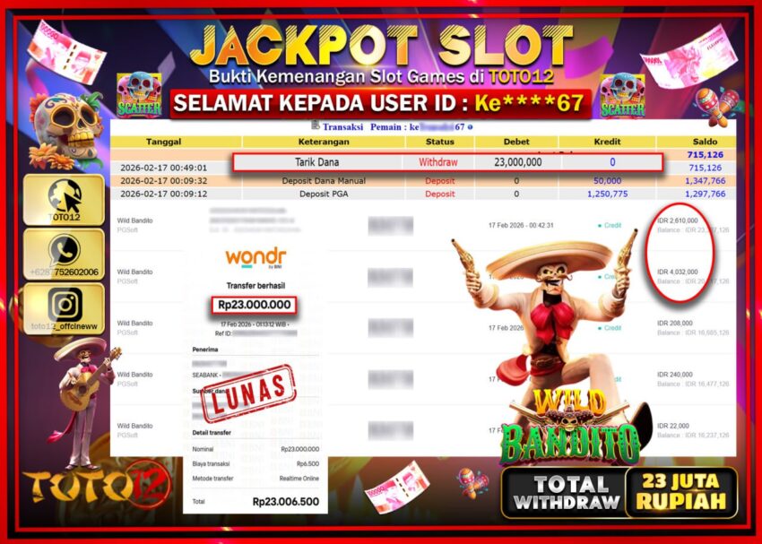 Selamat kepada Member Kami Ke******67 Telah Jackpot dan berhasil mendapatkan kemenangan besar pada permainan JACKPOT SLOT GAME (WILD BANDITO) Dengan Kemenangan Sebesar Rp.23.000.000–.