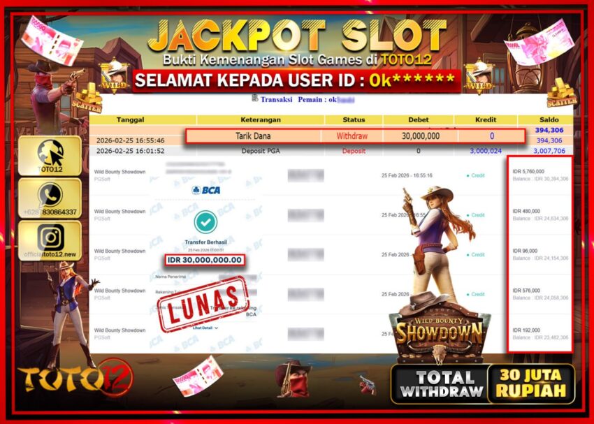 Selamat kepada Member Kami Ok***** Telah Jackpot dan berhasil mendapatkan kemenangan besar pada permainan JACKPOT SLOT GAME (WILD BOUNTY SHOWDOWN) Dengan Kemenangan Sebesar Rp.30.000.000–.