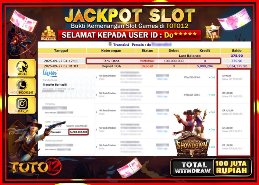 Selamat kepada Member Kami Do****** Telah Jackpot dan berhasil mendapatkan kemenangan besar pada permainan JACKPOT SLOT GAME (WILD BOUNTY SHOWDOWN) Dengan Kemenangan Sebesar Rp.100.000.000 –. Setelah mengisi Fomulir Withdraw dengan Kurang waktu 1-2 Menit Dana sudah kami Trasnfer kepada Pemilik Userid dan dana sudah dapat di cairkan oleh pemenang. Bukti Pembayaran yang TOTO12 berikan merupakan Bukti Pembayaran yang SAH / VALID yang langsung Di dapatkan melalui transaksi dari Bank yang di Tunju.
