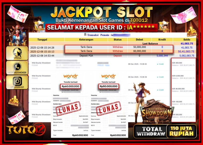 Selamat kepada Member Kami Ia****** Telah Jackpot dan berhasil mendapatkan kemenangan besar pada permainan JACKPOT SLOT GAME (WILD BOUNTY SHOWDOWN) Dengan Kemenangan Sebesar Rp.110.000.000 –.