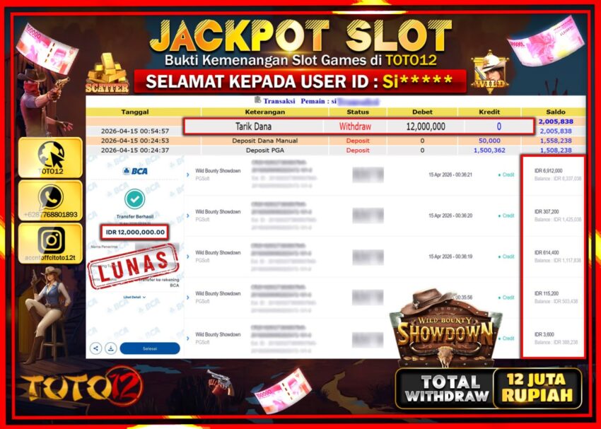 Selamat kepada Member Kami Si***** Telah Jackpot dan berhasil mendapatkan kemenangan besar pada permainan JACKPOT SLOT GAME  (WILD BOUNTY SHOWDOWN)  Dengan Kemenangan Sebesar Rp.12.000.000–.