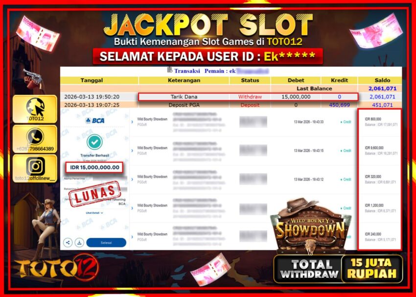 Selamat kepada Member Kami Ek****** Telah Jackpot dan berhasil mendapatkan kemenangan besar pada permainan JACKPOT SLOT GAME  (WILD BOUNTY SHOWDOWN)  Dengan Kemenangan Sebesar Rp.15.000.000.