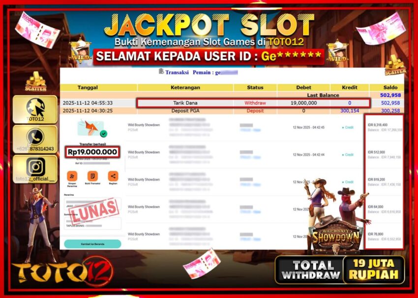 Selamat kepada Member Kami Ge****** Telah Jackpot dan berhasil mendapatkan kemenangan besar pada permainan JACKPOT SLOT GAME (WILD BOUNTY SHOWDOWN) Dengan Kemenangan Sebesar Rp.19.000.000 –. Setelah mengisi Fomulir Withdraw dengan Kurang waktu 1-2 Menit Dana sudah kami Trasnfer kepada Pemilik Userid dan dana sudah dapat di cairkan oleh pemenang. Bukti Pembayaran yang TOTO12 berikan merupakan Bukti Pembayaran yang SAH / VALID yang langsung Di dapatkan melalui transaksi dari Bank yang di Tunju.