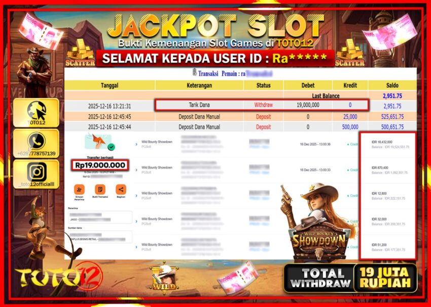 Selamat kepada Member Kami Ra****** Telah Jackpot dan berhasil mendapatkan kemenangan besar pada permainan JACKPOT SLOT GAME (WILD BOUNTY SHOWDOWN) Dengan Kemenangan Sebesar Rp.19.000.000 –.