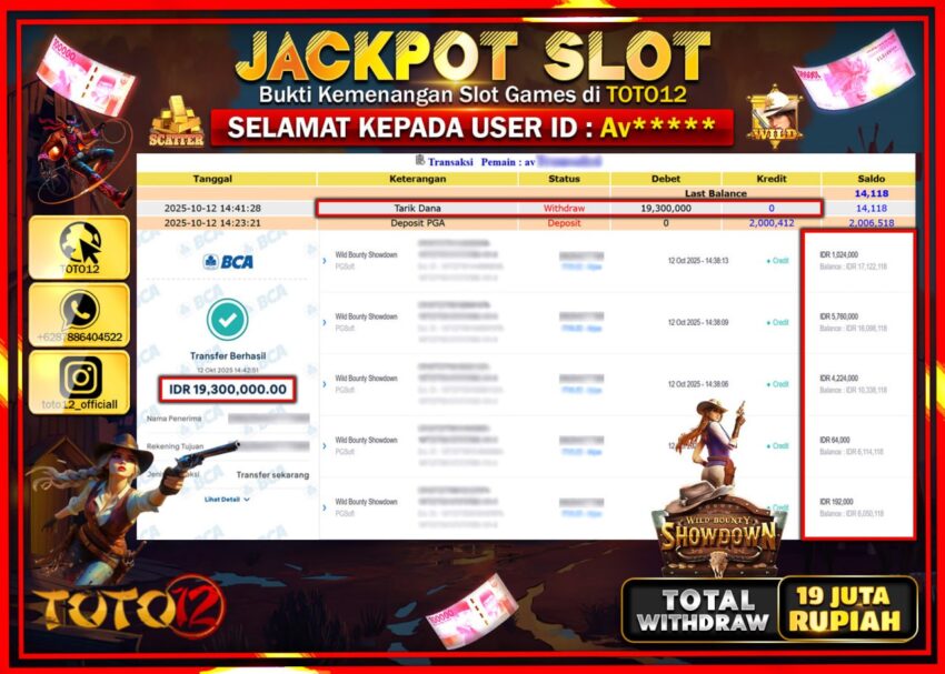 Selamat kepada Member Kami Av****** Telah Jackpot dan berhasil mendapatkan kemenangan besar pada permainan JACKPOT SLOT GAME (WILD BOUNTY SHOWDOWN) Dengan Kemenangan Sebesar Rp.19.300.000 –. Setelah mengisi Fomulir Withdraw dengan Kurang waktu 1-2 Menit Dana sudah kami Trasnfer kepada Pemilik Userid dan dana sudah dapat di cairkan oleh pemenang. Bukti Pembayaran yang TOTO12 berikan merupakan Bukti Pembayaran yang SAH / VALID yang langsung Di dapatkan melalui transaksi dari Bank yang di Tunju.