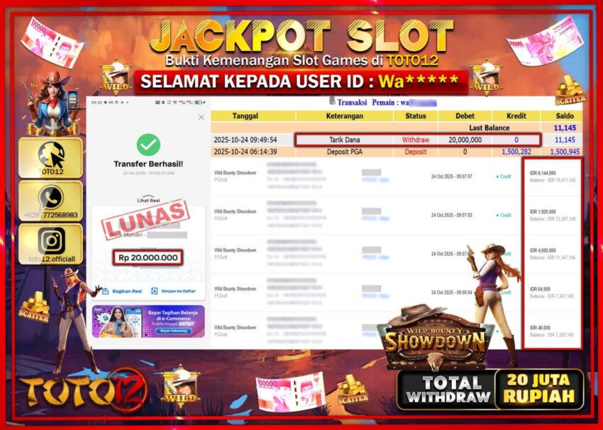 Selamat kepada Member Kami Wa****** Telah Jackpot dan berhasil mendapatkan kemenangan besar pada permainan JACKPOT SLOT GAME (WILD BOUNTY SHOWDOWN)  Dengan Kemenangan Sebesar Rp.20.000.000 –.  Setelah mengisi Fomulir Withdraw dengan Kurang waktu 1-2 Menit Dana sudah kami Trasnfer kepada Pemilik Userid dan dana sudah dapat di cairkan oleh pemenang. Bukti Pembayaran yang TOTO12 berikan merupakan Bukti Pembayaran yang  SAH / VALID yang langsung Di dapatkan melalui transaksi dari Bank yang di Tunju.