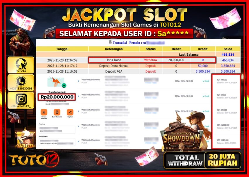Selamat kepada Member Kami Sa****** Telah Jackpot dan berhasil mendapatkan kemenangan besar pada permainan JACKPOT SLOT GAME (WILD BOUNTY SHOWDOWN) Dengan Kemenangan Sebesar Rp.20.000.000 –.