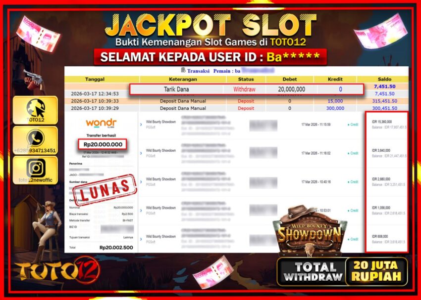 Selamat kepada Member Kami Ba****** Telah Jackpot dan berhasil mendapatkan kemenangan besar pada permainan JACKPOT SLOT GAME (WILD BOUNTY SHOWDOWN) Dengan Kemenangan Sebesar Rp.20.000.000.