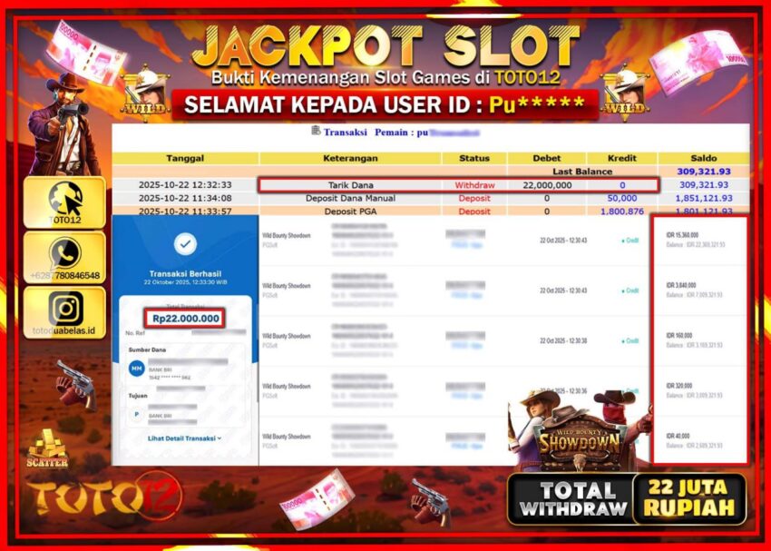 Selamat kepada Member Kami Pu****** Telah Jackpot dan berhasil mendapatkan kemenangan besar pada permainan JACKPOT SLOT GAME (WILD BOUNTY SHOWDOWN) Dengan Kemenangan Sebesar Rp.22.000.000 –. Setelah mengisi Fomulir Withdraw dengan Kurang waktu 1-2 Menit Dana sudah kami Trasnfer kepada Pemilik Userid dan dana sudah dapat di cairkan oleh pemenang. Bukti Pembayaran yang TOTO12 berikan merupakan Bukti Pembayaran yang SAH / VALID yang langsung Di dapatkan melalui transaksi dari Bank yang di Tunju.