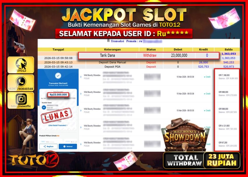 Selamat kepada Member Kami Ru****** Telah Jackpot dan berhasil mendapatkan kemenangan besar pada permainan JACKPOT SLOT GAME (WILD BOUNTY SHOWDOWN) Dengan Kemenangan Sebesar Rp.23.000.000.