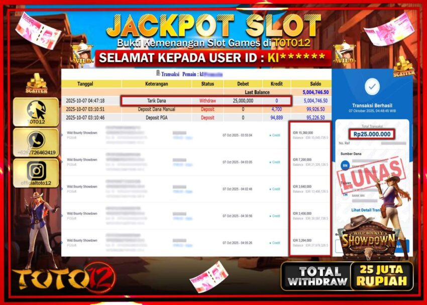 Selamat kepada Member Kami Kl****** Telah Jackpot dan berhasil mendapatkan kemenangan besar pada permainan JACKPOT SLOT GAME (WILD BOUNTY SHOWDOWN) Dengan Kemenangan Sebesar Rp.25.000.000 –. Setelah mengisi Fomulir Withdraw dengan Kurang waktu 1-2 Menit Dana sudah kami Trasnfer kepada Pemilik Userid dan dana sudah dapat di cairkan oleh pemenang. Bukti Pembayaran yang TOTO12 berikan merupakan Bukti Pembayaran yang SAH / VALID yang langsung Di dapatkan melalui transaksi dari Bank yang di Tunju.