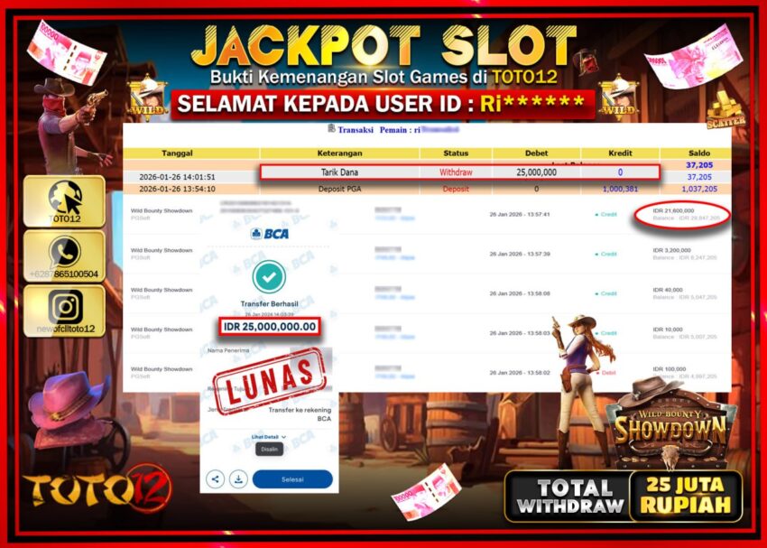 Selamat kepada Member Kami Ri****** Telah Jackpot dan berhasil mendapatkan kemenangan besar pada permainan JACKPOT SLOT GAME (WILD BOUNTY SHOWDOWN)  Dengan Kemenangan Sebesar Rp.25.000.000 –.