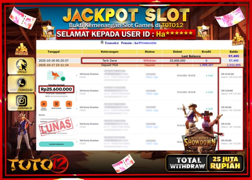 Selamat kepada Member Kami Ha****** Telah Jackpot dan berhasil mendapatkan kemenangan besar pada permainan JACKPOT SLOT GAME (WILD BOUNTY SHOWDOWN)  Dengan Kemenangan Sebesar Rp.25.600.000 –.  Setelah mengisi Fomulir Withdraw dengan Kurang waktu 1-2 Menit Dana sudah kami Trasnfer kepada Pemilik Userid dan dana sudah dapat di cairkan oleh pemenang. Bukti Pembayaran yang TOTO12 berikan merupakan Bukti Pembayaran yang  SAH / VALID yang langsung Di dapatkan melalui transaksi dari Bank yang di Tunju.