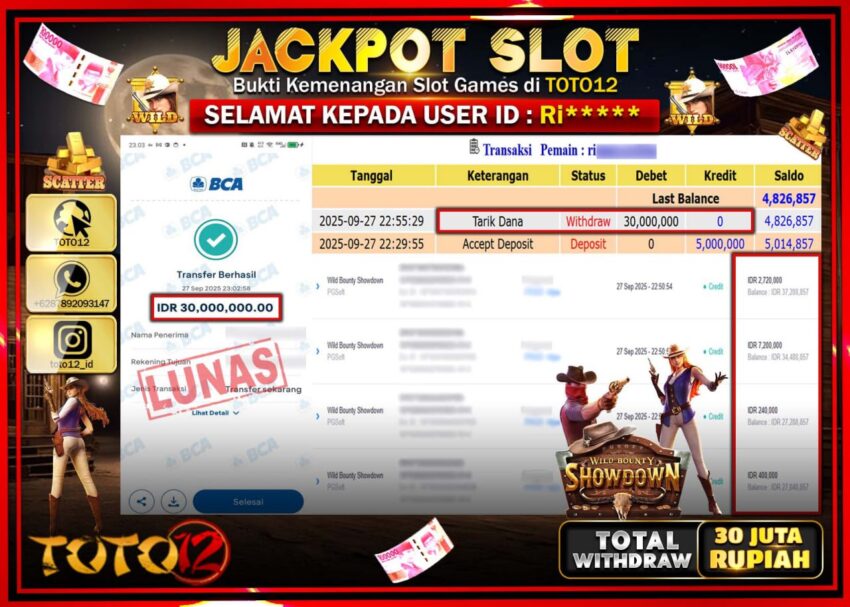 Selamat kepada Member Kami Ri****** Telah Jackpot dan berhasil mendapatkan kemenangan besar pada permainan JACKPOT SLOT GAME (WILD BOUNTY SHOWDOWN) Dengan Kemenangan Sebesar Rp.30.000.000 –. Setelah mengisi Fomulir Withdraw dengan Kurang waktu 1-2 Menit Dana sudah kami Trasnfer kepada Pemilik Userid dan dana sudah dapat di cairkan oleh pemenang. Bukti Pembayaran yang TOTO12 berikan merupakan Bukti Pembayaran yang SAH / VALID yang langsung Di dapatkan melalui transaksi dari Bank yang di Tunju.