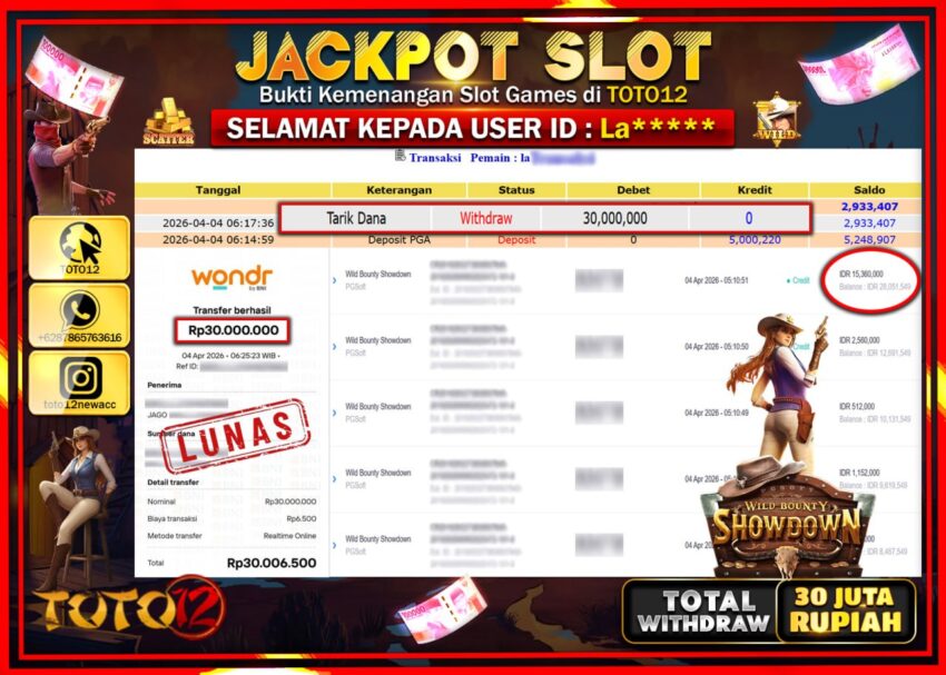 Selamat kepada Member Kami La***** Telah Jackpot dan berhasil mendapatkan kemenangan besar pada permainan JACKPOT SLOT GAME (WILD BOUNTY SHOWDOWN) Dengan Kemenangan Sebesar Rp.30.000.000–.