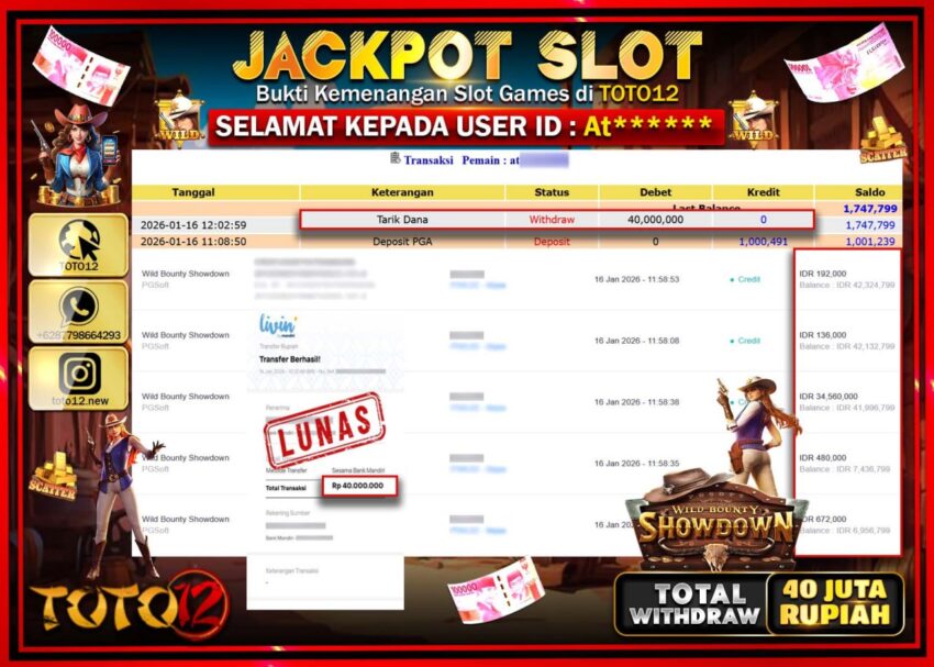 Selamat kepada Member Kami At****** Telah Jackpot dan berhasil mendapatkan kemenangan besar pada permainan JACKPOT SLOT GAME (WILD BOUNTY SHOWDOWN)  Dengan Kemenangan Sebesar Rp.40.000.000 –.