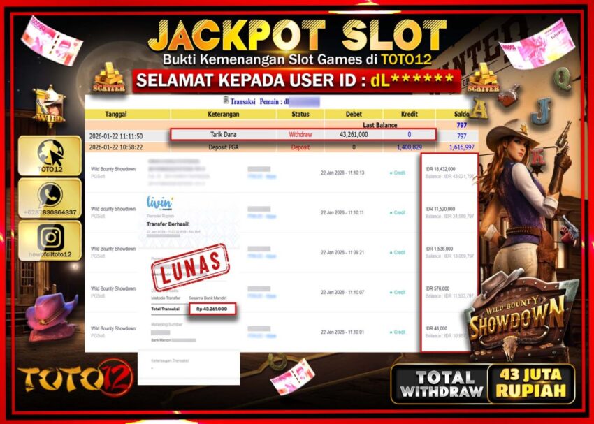 Selamat kepada Member Kami Dl****** Telah Jackpot dan berhasil mendapatkan kemenangan besar pada permainan JACKPOT SLOT GAME (WILD BOUNTY SHOWDOWN) Dengan Kemenangan Sebesar Rp.43.261.000 –.