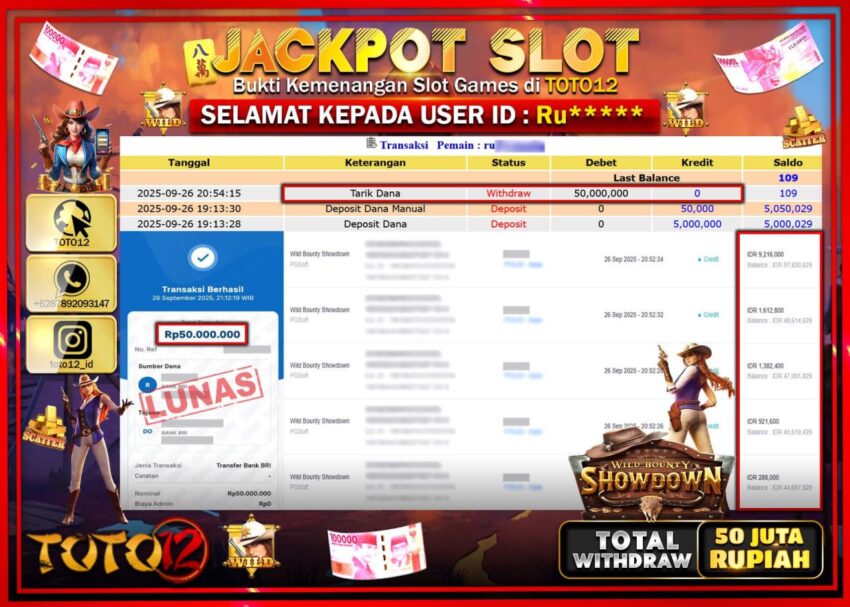 Selamat kepada Member Kami Ru****** Telah Jackpot dan berhasil mendapatkan kemenangan besar pada permainan JACKPOT SLOT GAME (WILD BOUNTY SHOWDOWN)  Dengan Kemenangan Sebesar Rp.50.000.000 –.  Setelah mengisi Fomulir Withdraw dengan Kurang waktu 1-2 Menit Dana sudah kami Trasnfer kepada Pemilik Userid dan dana sudah dapat di cairkan oleh pemenang. Bukti Pembayaran yang TOTO12 berikan merupakan Bukti Pembayaran yang  SAH / VALID yang langsung Di dapatkan melalui transaksi dari Bank yang di Tunju.