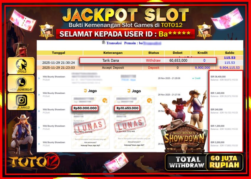 Selamat kepada Member Kami Ba****** Telah Jackpot dan berhasil mendapatkan kemenangan besar pada permainan JACKPOT SLOT GAME (WILD BOUNTY SHOWDOWN) Dengan Kemenangan Sebesar Rp.60.653.000 –.