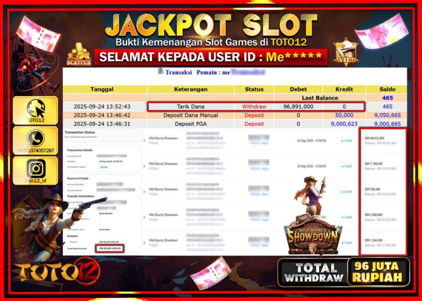 Selamat kepada Member Kami Me****** Telah Jackpot dan berhasil mendapatkan kemenangan besar pada permainan JACKPOT SLOT GAME (WILD BOUNTY SHOWDOWN) Dengan Kemenangan Sebesar Rp.96.891.000 –. Setelah mengisi Fomulir Withdraw dengan Kurang waktu 1-2 Menit Dana sudah kami Trasnfer kepada Pemilik Userid dan dana sudah dapat di cairkan oleh pemenang. Bukti Pembayaran yang TOTO12 berikan merupakan Bukti Pembayaran yang SAH / VALID yang langsung Di dapatkan melalui transaksi dari Bank yang di Tunju.