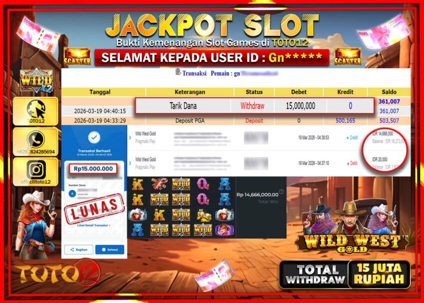 Selamat kepada Member Kami Gn**** Telah Jackpot dan berhasil mendapatkan kemenangan besar pada permainan JACKPOT SLOT GAME  (WILD WEST GOLD)  Dengan Kemenangan Sebesar Rp.15.000.000–.