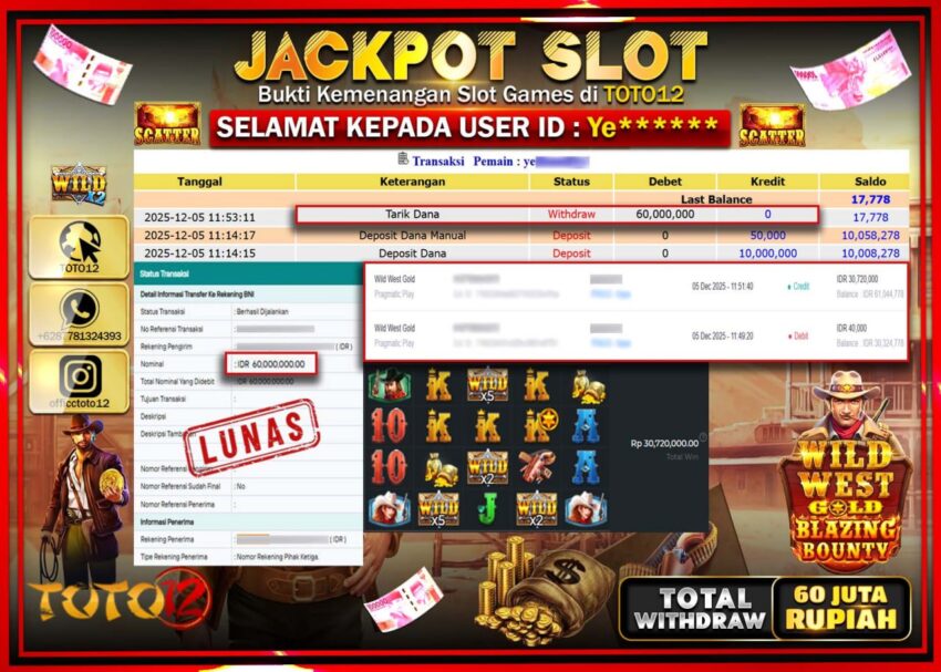 Selamat kepada Member Kami Ye****** Telah Jackpot dan berhasil mendapatkan kemenangan besar pada permainan JACKPOT SLOT GAME (WILD WEST GOLD) Dengan Kemenangan Sebesar Rp.60.000.000 –.