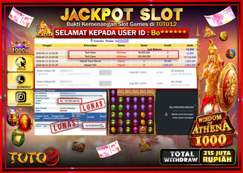 Selamat kepada Member Kami Bo***** Telah Jackpot dan berhasil mendapatkan kemenangan besar pada permainan JACKPOT SLOT GAME (WISDOM OF ATHENA 1000) Dengan Kemenangan Sebesar Rp.215.000.000–.
