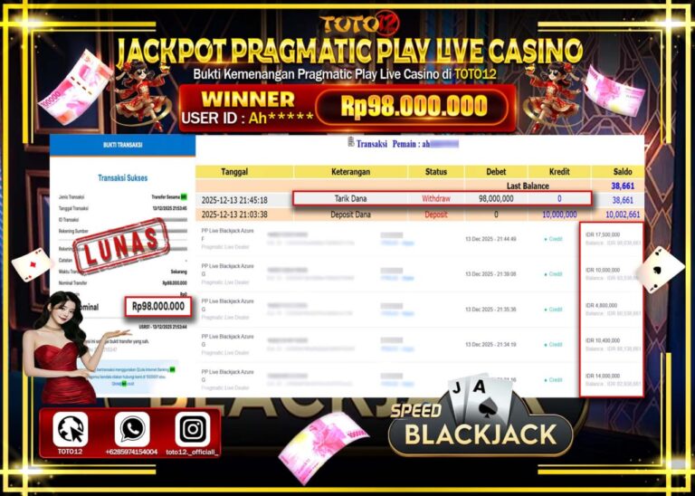 HANYA DI TOTO12 JP PASTI DI BAYAR LUNAS DAN CEPAT!!!!!! JACKPOT PRAGMATIC PLAY LIVE CASINO (BLACKJACK AZURE) Rp.98.000.000 !!!!