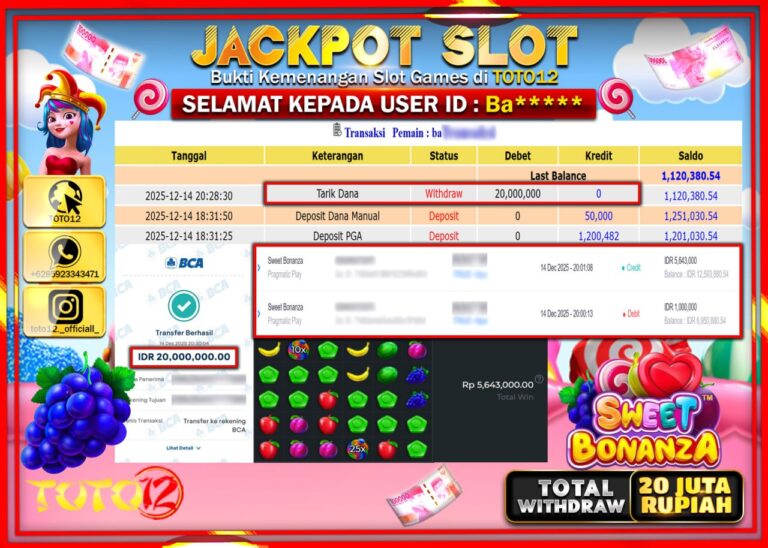 Selamat kepada Member Kami Ba****** Telah Jackpot dan berhasil mendapatkan kemenangan besar pada permainan JACKPOT SLOT GAME (SWEET BONANZA) Dengan Kemenangan Sebesar Rp.20.000.000 –. Setelah mengisi Fomulir Withdraw dengan Kurang waktu 1-2 Menit Dana sudah kami Trasnfer kepada Pemilik Userid dan dana sudah dapat di cairkan oleh pemenang. Bukti Pembayaran yang TOTO12 berikan merupakan Bukti Pembayaran…