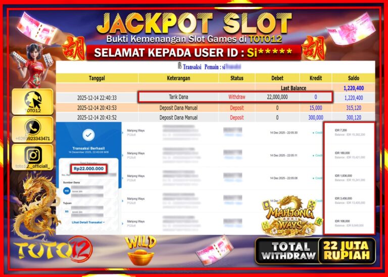 Selamat kepada Member Kami Si****** Telah Jackpot dan berhasil mendapatkan kemenangan besar pada permainan JACKPOT SLOT GAME (MAHJONG WAYS) Dengan Kemenangan Sebesar Rp.22.000.000 –. Setelah mengisi Fomulir Withdraw dengan Kurang waktu 1-2 Menit Dana sudah kami Trasnfer kepada Pemilik Userid dan dana sudah dapat di cairkan oleh pemenang. Bukti Pembayaran yang TOTO12 berikan merupakan Bukti Pembayaran…
