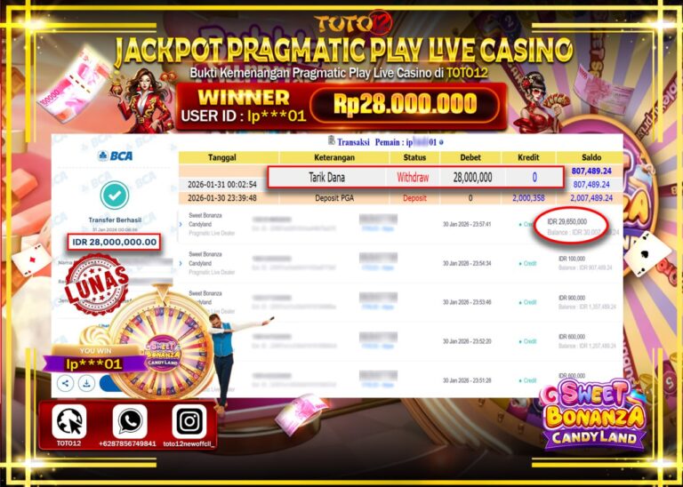 Selamat kepada Member Kami Ip****** Telah Jackpot dan berhasil mendapatkan kemenangan besar pada permainan JACKPOT PRAGMATIC PLAY LIVE CASINO (SWEET BONANZA CANDY LAND) Dengan Kemenangan Sebesar Rp.28.000.000 –. Setelah mengisi Fomulir Withdraw dengan Kurang waktu 1-2 Menit Dana sudah kami Trasnfer kepada Pemilik Userid dan dana sudah dapat di cairkan oleh pemenang. Bukti Pembayaran yang TOTO12…