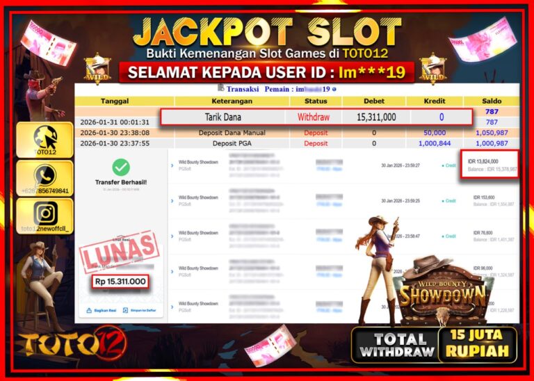 Selamat kepada Member Kami Im****** Telah Jackpot dan berhasil mendapatkan kemenangan besar pada permainan JACKPOT SLOT GAME (WILD BOUNTY SHOWDOWN) Dengan Kemenangan Sebesar Rp.15.311.000 –. Setelah mengisi Fomulir Withdraw dengan Kurang waktu 1-2 Menit Dana sudah kami Trasnfer kepada Pemilik Userid dan dana sudah dapat di cairkan oleh pemenang. Bukti Pembayaran yang TOTO12 berikan merupakan Bukti…