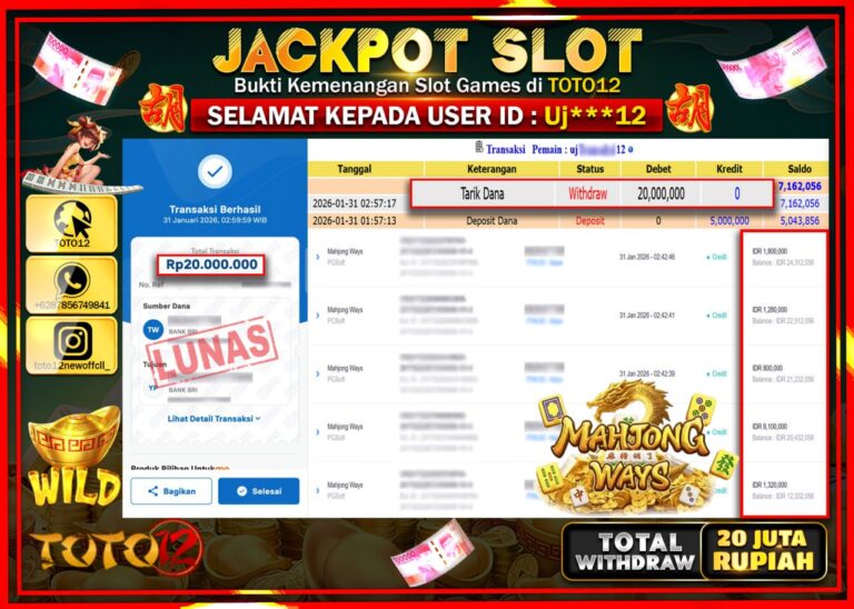 Selamat kepada Member Kami Uj****** Telah Jackpot dan berhasil mendapatkan kemenangan besar pada permainan JACKPOT SLOT GAME (MAHJONG WAYS) Dengan Kemenangan Sebesar Rp.20.000.000 –. Setelah mengisi Fomulir Withdraw dengan Kurang waktu 1-2 Menit Dana sudah kami Trasnfer kepada Pemilik Userid dan dana sudah dapat di cairkan oleh pemenang. Bukti Pembayaran yang TOTO12 berikan merupakan Bukti Pembayaran…