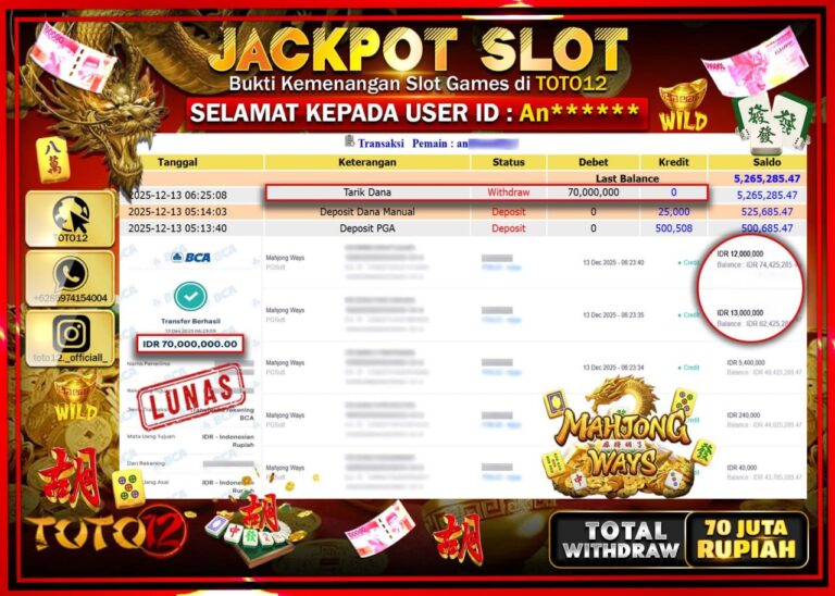 Selamat kepada Member Kami An****** Telah Jackpot dan berhasil mendapatkan kemenangan besar pada permainan JACKPOT SLOT GAME (MAHJONG WAYS) Dengan Kemenangan Sebesar Rp.70.000.000 –. Setelah mengisi Fomulir Withdraw dengan Kurang waktu 1-2 Menit Dana sudah kami Trasnfer kepada Pemilik Userid dan dana sudah dapat di cairkan oleh pemenang. Bukti Pembayaran yang TOTO12 berikan merupakan Bukti Pembayaran…