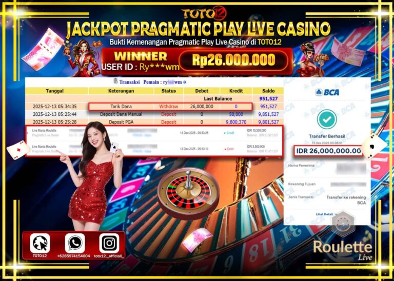 HANYA DI TOTO12 JP PASTI DI BAYAR LUNAS DAN CEPAT!!!!!! JACKPOT PRAGMATIC PLAY LIVE CASINO (MANIA ROULETTE) Rp.26.000.000 !!!!