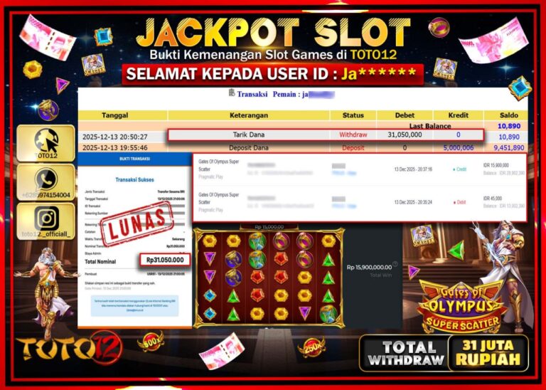 Selamat kepada Member Kami Ja****** Telah Jackpot dan berhasil mendapatkan kemenangan besar pada permainan JACKPOT SLOT GAME (GATES OF OLYMPUS SUPER SCATTER) Dengan Kemenangan Sebesar Rp.31.050.000 –. Setelah mengisi Fomulir Withdraw dengan Kurang waktu 1-2 Menit Dana sudah kami Trasnfer kepada Pemilik Userid dan dana sudah dapat di cairkan oleh pemenang. Bukti Pembayaran yang TOTO12 berikan…