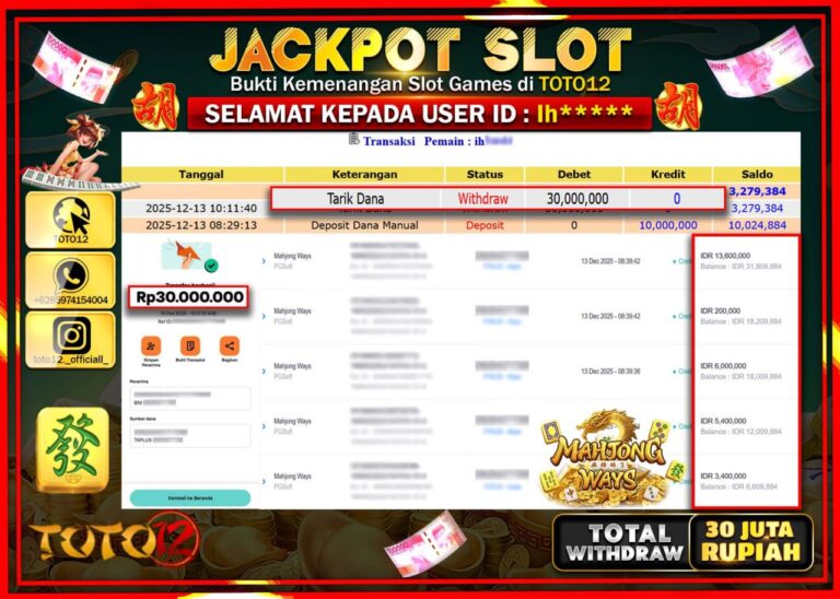 Selamat kepada Member Kami Ih****** Telah Jackpot dan berhasil mendapatkan kemenangan besar pada permainan JACKPOT SLOT GAME (MAHJONG WAYS) Dengan Kemenangan Sebesar Rp.30.000.000 –. Setelah mengisi Fomulir Withdraw dengan Kurang waktu 1-2 Menit Dana sudah kami Trasnfer kepada Pemilik Userid dan dana sudah dapat di cairkan oleh pemenang. Bukti Pembayaran yang TOTO12 berikan merupakan Bukti Pembayaran…