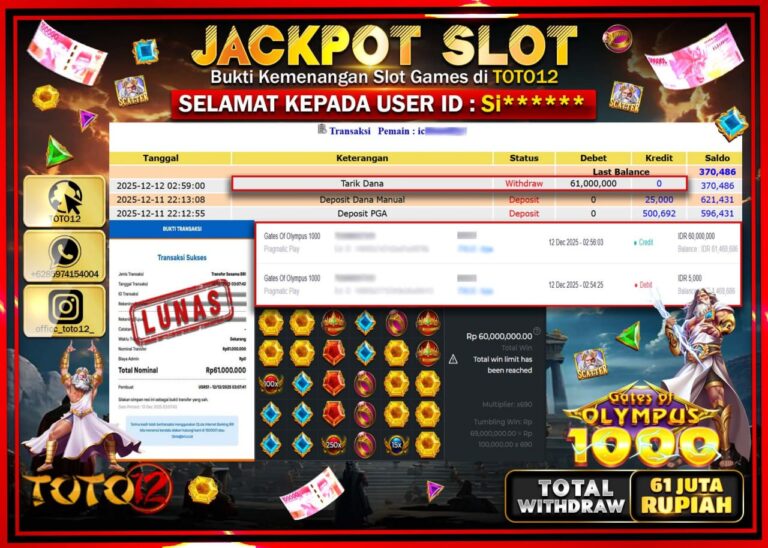 Selamat kepada Member Kami Si****** Telah Jackpot dan berhasil mendapatkan kemenangan besar pada permainan JACKPOT SLOT GAME (GATES OF OLYMPUS 1000) Dengan Kemenangan Sebesar Rp.61.000.000 –. Setelah mengisi Fomulir Withdraw dengan Kurang waktu 1-2 Menit Dana sudah kami Trasnfer kepada Pemilik Userid dan dana sudah dapat di cairkan oleh pemenang. Bukti Pembayaran yang TOTO12 berikan merupakan…