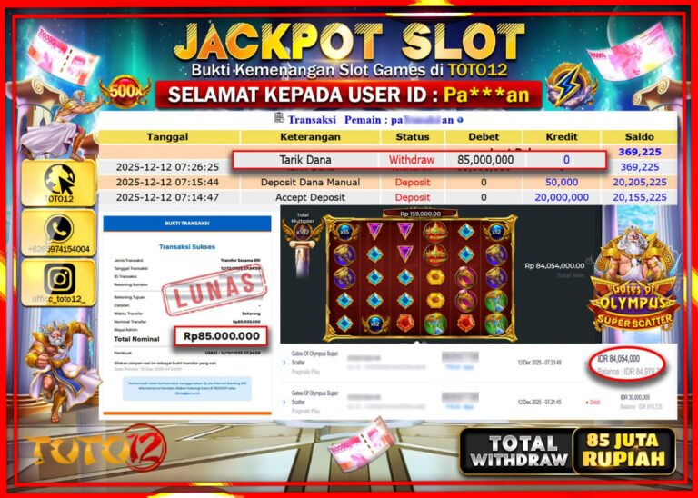 Selamat kepada Member Kami Pa****** Telah Jackpot dan berhasil mendapatkan kemenangan besar pada permainan JACKPOT SLOT GAME (GATES OF OLYMPUS SUPER SCATTER) Dengan Kemenangan Sebesar Rp.85.000.000 –. Setelah mengisi Fomulir Withdraw dengan Kurang waktu 1-2 Menit Dana sudah kami Trasnfer kepada Pemilik Userid dan dana sudah dapat di cairkan oleh pemenang. Bukti Pembayaran yang TOTO12 berikan…