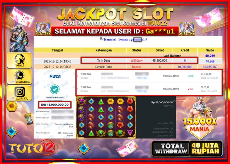 Selamat kepada Member Kami Ga****** Telah Jackpot dan berhasil mendapatkan kemenangan besar pada permainan JACKPOT SLOT GAME (15.000X MANIA) Dengan Kemenangan Sebesar Rp.48.900.000 –. Setelah mengisi Fomulir Withdraw dengan Kurang waktu 1-2 Menit Dana sudah kami Trasnfer kepada Pemilik Userid dan dana sudah dapat di cairkan oleh pemenang. Bukti Pembayaran yang TOTO12 berikan merupakan Bukti Pembayaran…