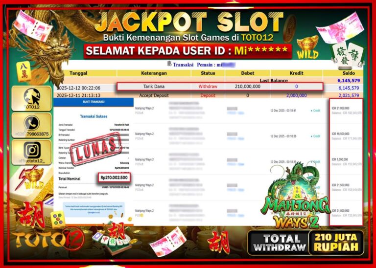 Selamat kepada Member Kami Mi****** Telah Jackpot dan berhasil mendapatkan kemenangan besar pada permainan JACKPOT SLOT GAME (MAHJONG WAYS 2) Dengan Kemenangan Sebesar Rp.210.000.000 –. Setelah mengisi Fomulir Withdraw dengan Kurang waktu 1-2 Menit Dana sudah kami Trasnfer kepada Pemilik Userid dan dana sudah dapat di cairkan oleh pemenang. Bukti Pembayaran yang TOTO12 berikan merupakan Bukti…