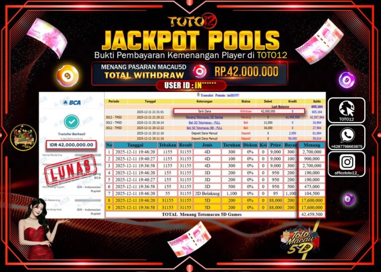 Selamat kepada Member Kami In****** Telah Jackpot dan berhasil mendapatkan kemenangan besar pada permainan JACKPOT POOLS PASARAN (MACAU 5D) Dengan Kemenangan Sebesar Rp.42.000.000 –. Setelah mengisi Fomulir Withdraw dengan Kurang waktu 1-2 Menit Dana sudah kami Trasnfer kepada Pemilik Userid dan dana sudah dapat di cairkan oleh pemenang. Bukti Pembayaran yang TOTO12 berikan merupakan Bukti Pembayaran…
