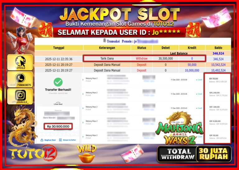 Selamat kepada Member Kami Jo****** Telah Jackpot dan berhasil mendapatkan kemenangan besar pada permainan JACKPOT SLOT GAME (MAHJONG WAYS 2) Dengan Kemenangan Sebesar Rp.30.500.000 –. Setelah mengisi Fomulir Withdraw dengan Kurang waktu 1-2 Menit Dana sudah kami Trasnfer kepada Pemilik Userid dan dana sudah dapat di cairkan oleh pemenang. Bukti Pembayaran yang TOTO12 berikan merupakan Bukti…