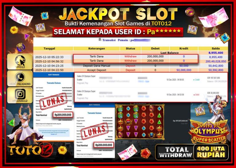 Selamat kepada Member Kami Pa****** Telah Jackpot dan berhasil mendapatkan kemenangan besar pada permainan JACKPOT SLOT GAME (GATES OF OLYMPUS SUPER SCATTER) Dengan Kemenangan Sebesar Rp.400.000.000 –. Setelah mengisi Fomulir Withdraw dengan Kurang waktu 1-2 Menit Dana sudah kami Trasnfer kepada Pemilik Userid dan dana sudah dapat di cairkan oleh pemenang. Bukti Pembayaran yang TOTO12 berikan…