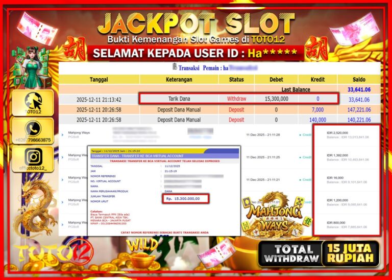 Selamat kepada Member Kami Ha****** Telah Jackpot dan berhasil mendapatkan kemenangan besar pada permainan JACKPOT SLOT GAME (MAHJONG WAYS) Dengan Kemenangan Sebesar Rp.15.300.000 –. Setelah mengisi Fomulir Withdraw dengan Kurang waktu 1-2 Menit Dana sudah kami Trasnfer kepada Pemilik Userid dan dana sudah dapat di cairkan oleh pemenang. Bukti Pembayaran yang TOTO12 berikan merupakan Bukti Pembayaran…