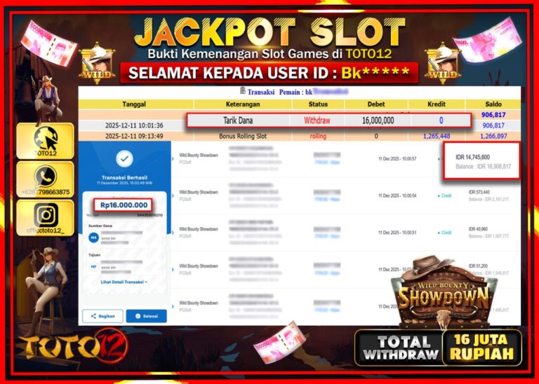 Selamat kepada Member Kami Bk****** Telah Jackpot dan berhasil mendapatkan kemenangan besar pada permainan JACKPOT SLOT GAME (WILD BOUNTY SHOWDOWN) Dengan Kemenangan Sebesar Rp.16.000.000 –. Setelah mengisi Fomulir Withdraw dengan Kurang waktu 1-2 Menit Dana sudah kami Trasnfer kepada Pemilik Userid dan dana sudah dapat di cairkan oleh pemenang. Bukti Pembayaran yang TOTO12 berikan merupakan Bukti…