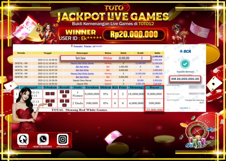 HANYA DI TOTO12 JP PASTI DI BAYAR LUNAS DAN CEPAT!!!!!! JACKPOT LIVE GAMES (RED WHITE) Rp.20.000.000 !!!!