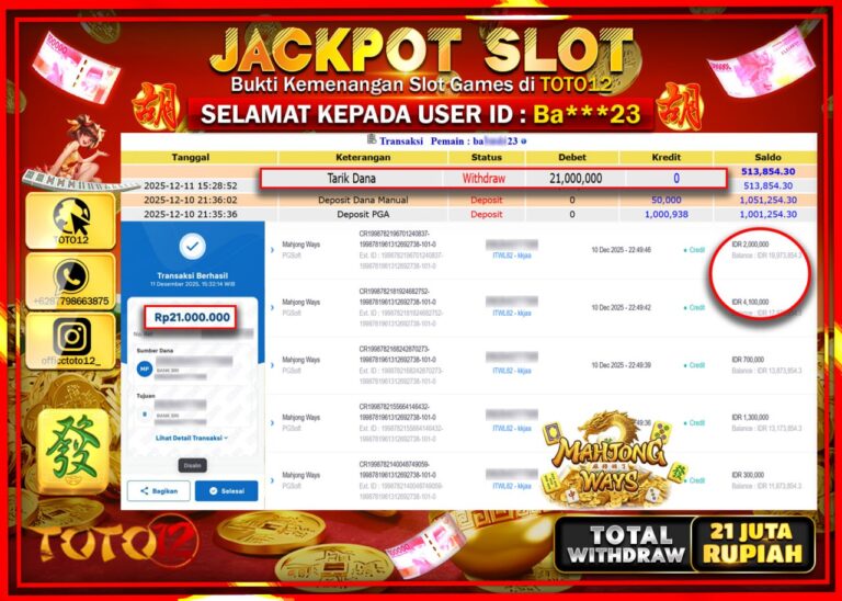 Selamat kepada Member Kami Ba****** Telah Jackpot dan berhasil mendapatkan kemenangan besar pada permainan JACKPOT SLOT GAME (MAHJONG WAYS) Dengan Kemenangan Sebesar Rp.21.000.000 –. Setelah mengisi Fomulir Withdraw dengan Kurang waktu 1-2 Menit Dana sudah kami Trasnfer kepada Pemilik Userid dan dana sudah dapat di cairkan oleh pemenang. Bukti Pembayaran yang TOTO12 berikan merupakan Bukti Pembayaran…