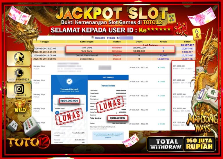 Selamat kepada Member Kami Ke**** Telah Jackpot dan berhasil mendapatkan kemenangan besar pada permainan JACKPOT SLOT GAME (MAHJONG WAYS) Dengan Kemenangan Sebesar Rp.160.000.000–. Setelah mengisi Fomulir Withdraw dengan Kurang waktu 1-2 Menit Dana sudah kami Trasnfer kepada Pemilik Userid dan dana sudah dapat di cairkan oleh pemenang. Bukti Pembayaran yang TOTO12 berikan merupakan Bukti Pembayaran yang SAH…