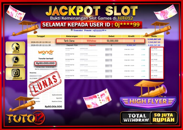 Selamat kepada Member Kami 0j****99 Telah Jackpot dan berhasil mendapatkan kemenangan besar pada permainan JACKPOT SLOT GAME (SLOT MANIA HIGH FLAYER) Dengan Kemenangan Sebesar Rp.50.000.000–. Setelah mengisi Fomulir Withdraw dengan Kurang waktu 1-2 Menit Dana sudah kami Trasnfer kepada Pemilik Userid dan dana sudah dapat di cairkan oleh pemenang. Bukti Pembayaran yang TOTO12 berikan merupakan Bukti…